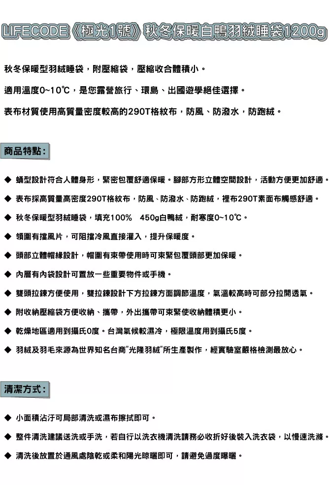 【LIFECODE】《極光1號》秋冬保暖白鴨羽絨睡袋 1200g(桔色) 評價
